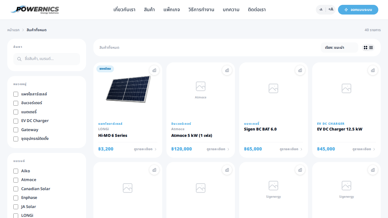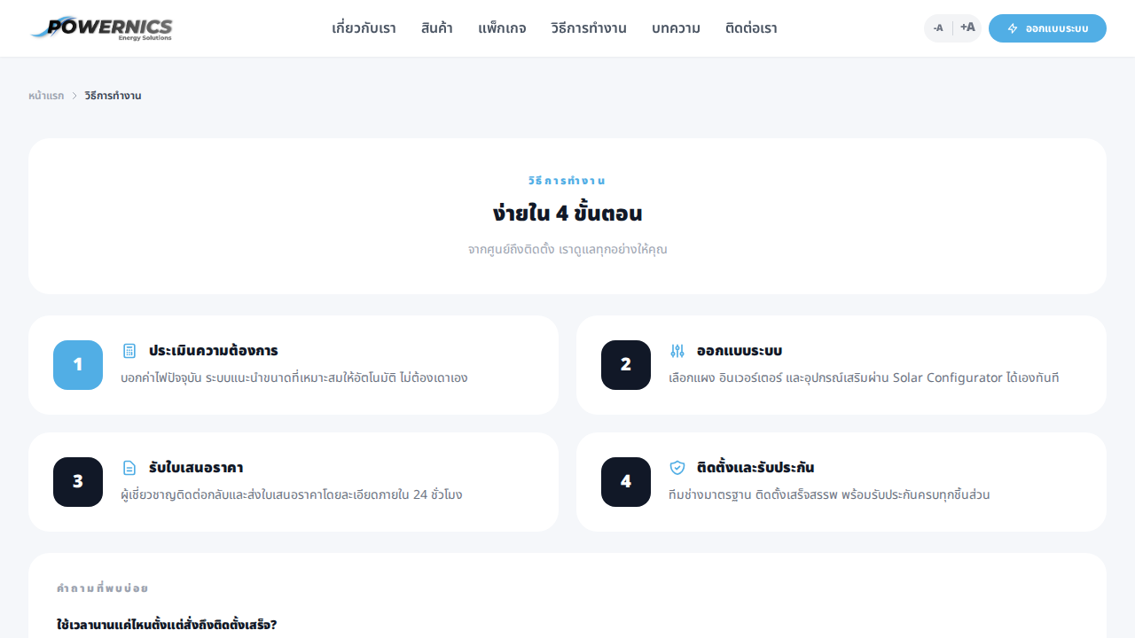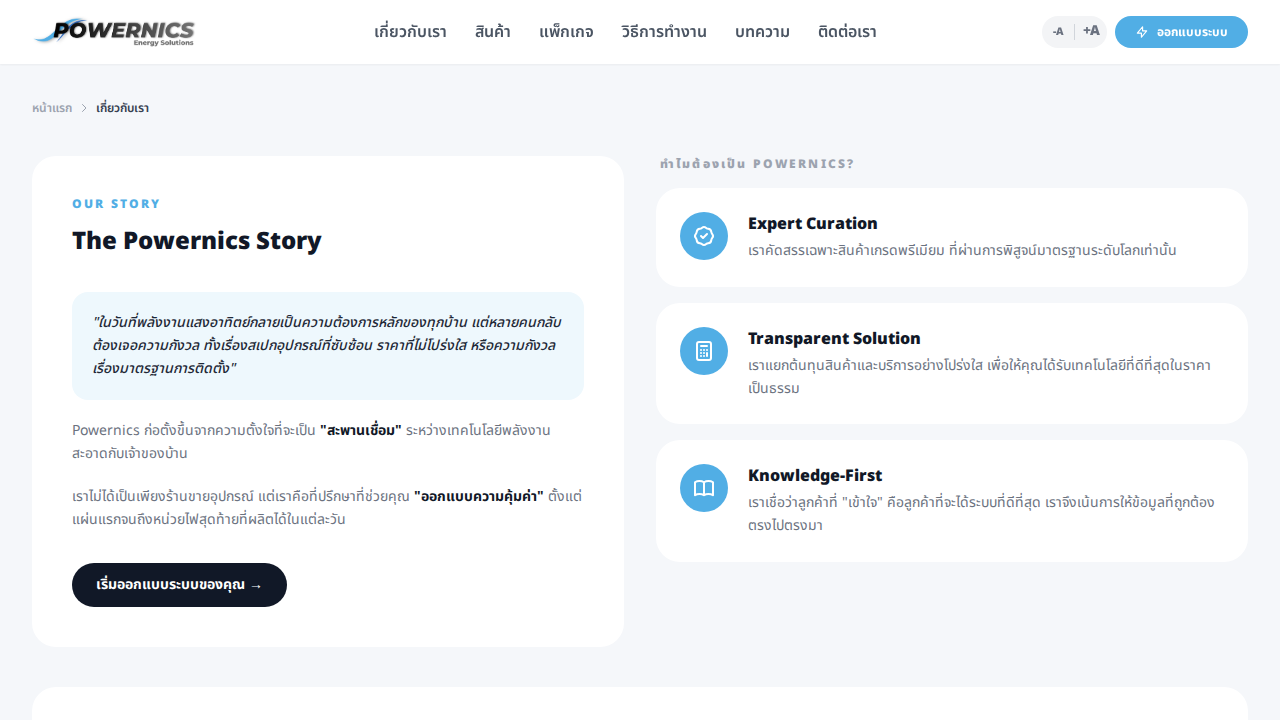 เว็บไซต์ของ Powernics ให้บริการออกแบบและติดตั้งระบบโซลาร์เซลล์แบบครบวงจร มีระบบคำนวณขนาดที่เหมาะสมกับค่าไฟ พร้อมนำเสนอแพ็กเกจราคาโปร่งใสและอุปกรณ์เกรดพรีเมียม
