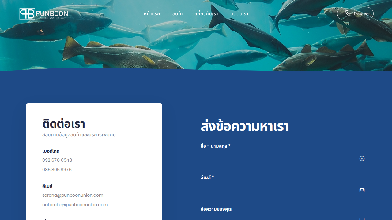 เว็บไซต์ของบริษัท พันธุ์บุญยูเนี่ยน จำกัด ผู้จัดจำหน่ายอาหารทะเลสดและแช่แข็งจากทั้งในและต่างประเทศ เน้นความสัมพันธ์กับชาวประมงพื้นบ้านรุ่นใหม่และคุณภาพของสินค้า