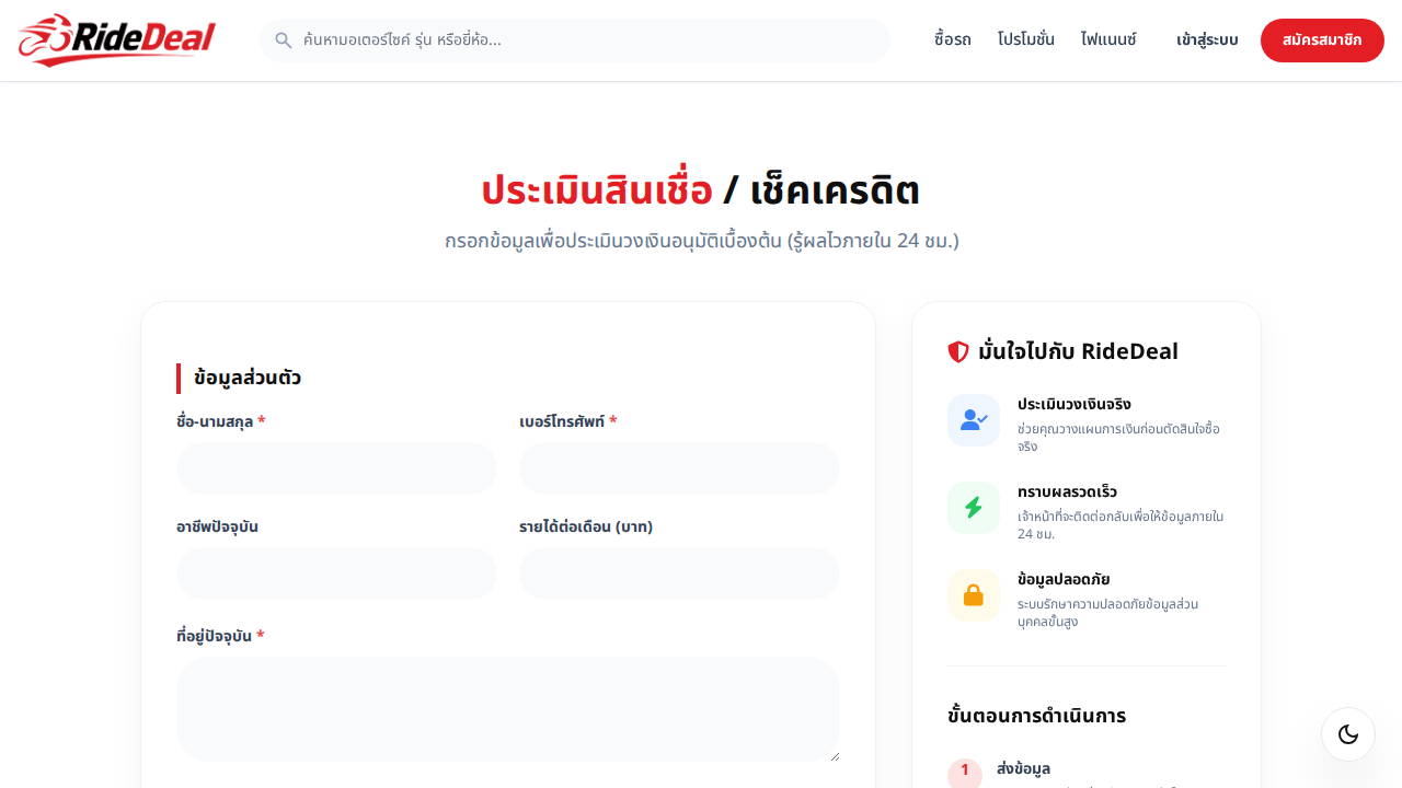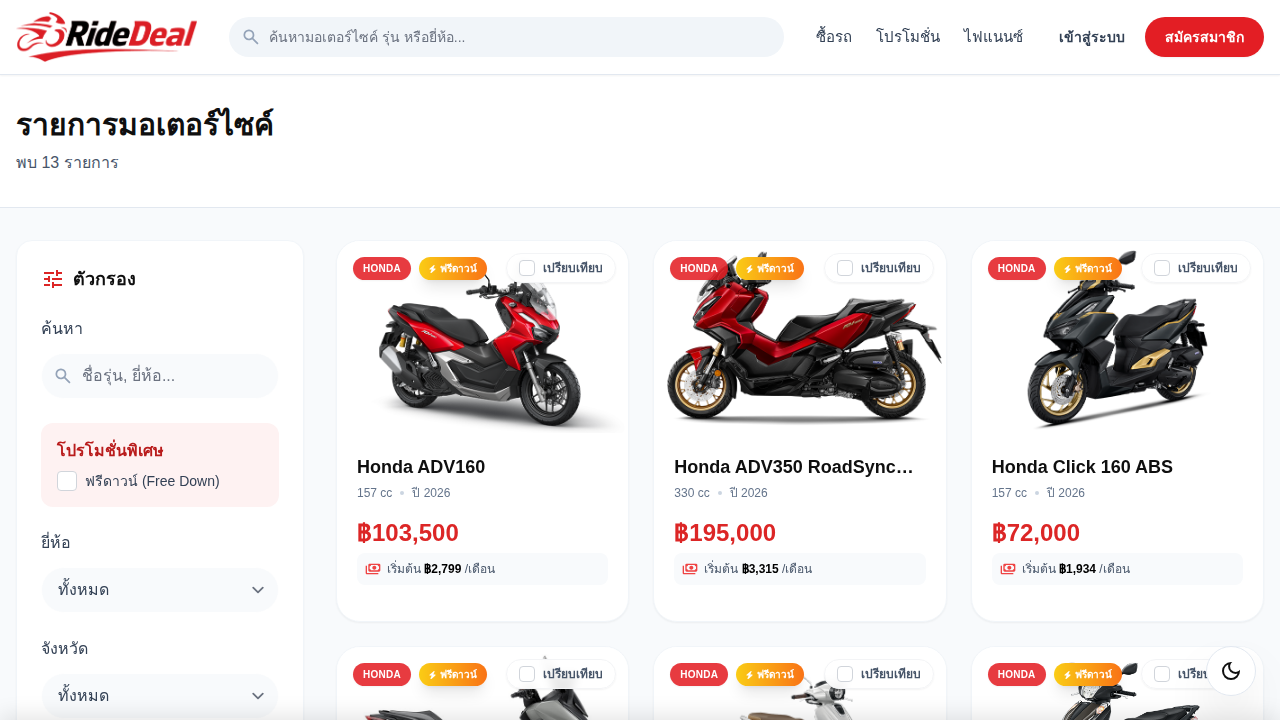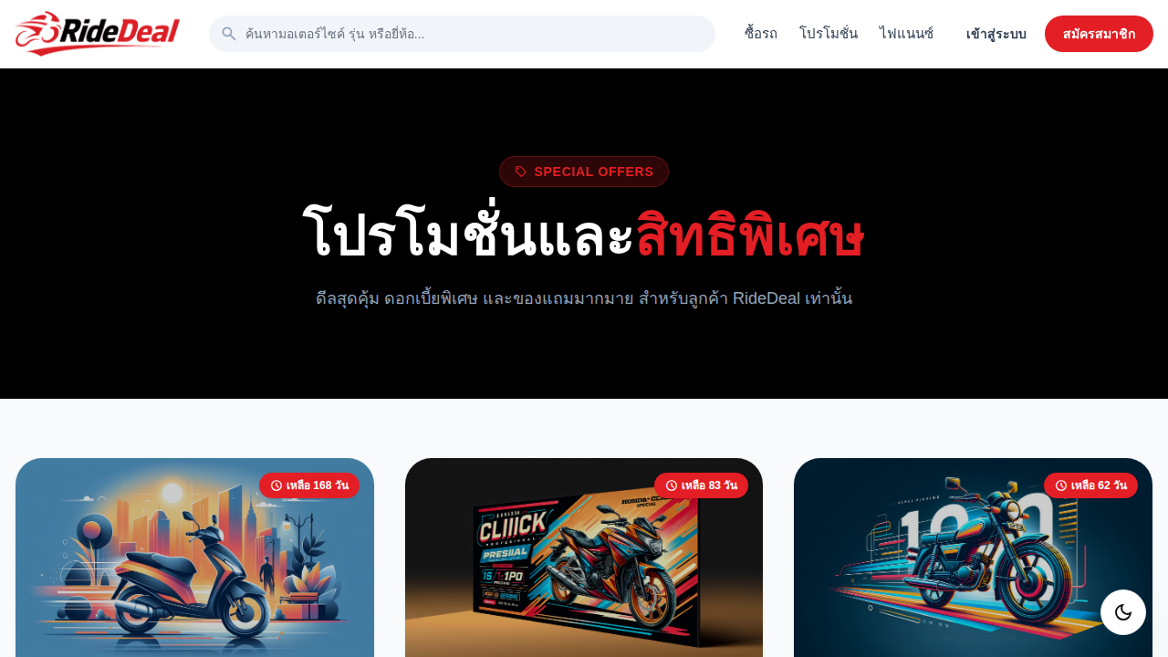 RideDeal คือแพลตฟอร์มตลาดรถมอเตอร์ไซค์มือหนึ่งที่ช่วยให้ผู้ใช้งานค้นหาและเลือกรถที่ตรงใจได้ง่ายขึ้น เว็บไซต์มาพร้อมกับระบบเช็กไฟแนนซ์ ค้นหาโปรโมชั่น และบทความสาระน่ารู้เกี่ยวกับมอเตอร์ไซค์อย่างครบครัน